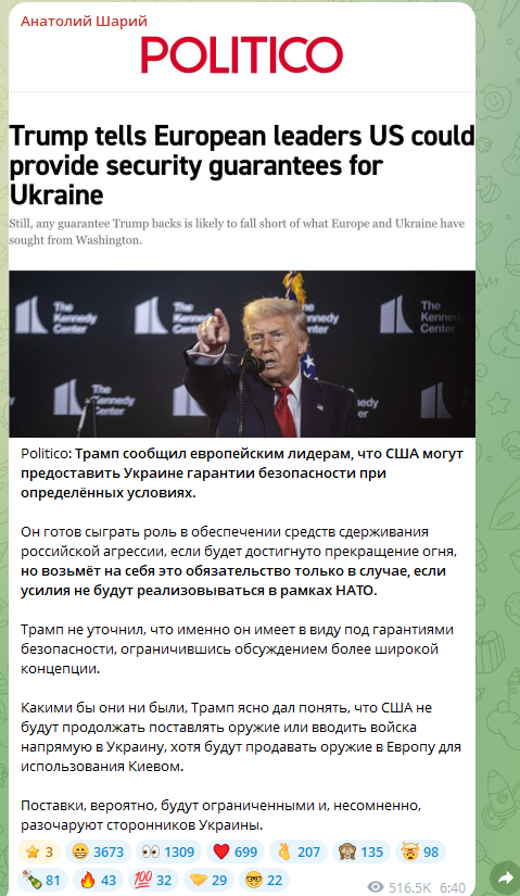Как пишет газета Politico, Трамп в ходе разговора, инициированного Германией, заявил о готовности обеспечить Киеву гарантии безопасности. Но при одном условии - НАТО в этом принимать участия не будет.
