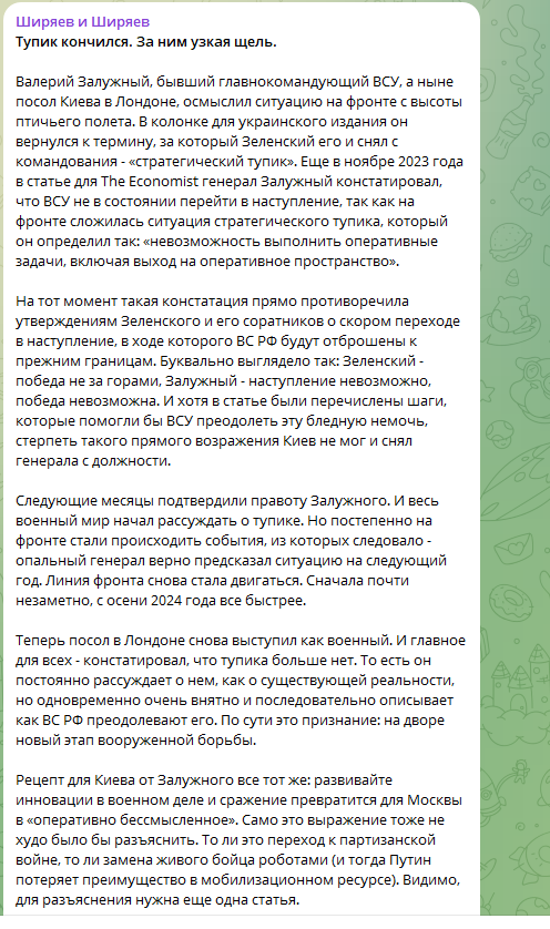 Военный эксперт Валерий Ширяев отмечает, что Залужный уже однажды был сурово наказан за свои рассуждения о тупике на поле боя. Речь, конечно, о статье для The Economist в ноябре 2023 года. Тогда, будучи ещё главкомом ВСУ, Залужный по сути разоблачил бахвальство Зеленского и его соратников, обещавших, что ВСУ вот-вот разгромят русскую армию.