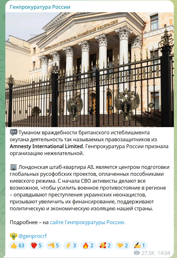 В официальном заявлении Генпрокуратуры говорится, что Amnesty International "позиционирует себя как активного защитника прав человека в мире", однако в действительности, как утверждается, она является "центром подготовки глобальных русофобских проектов". Ведомство также охарактеризовало её деятельность как "окутанную туманом враждебности британского истеблишмента".
