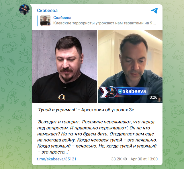Бывший советник офиса президента Украины Алексей Арестович* давно не церемонится с Владимиром Зеленским и не выбирает слов, характеризуя его. Тот грозит взорвать Крымский мост - экс-соратник называет главаря киевского режима "тупой и упрямый". Арестович* уверен, что в Киеве готовят провокации, чтобы сорвать объявленное Кремлём в честь Дня Победы перемирие. "Отодвигает вам ещё на полгода войну", - доступно объяснил цель Зеленского и заодно предупредил украинцев экс-советник ОП.