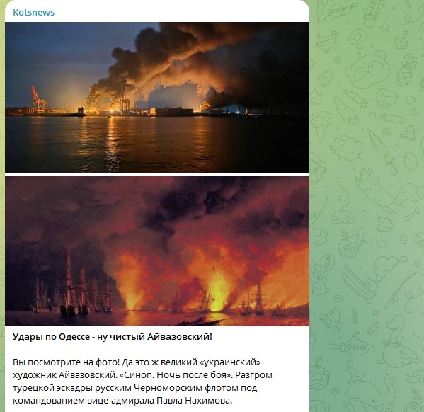 Удары по Одессе - ну чистый Айвазовский! Вы посмотрите на фото! Да это ж великий "украинский" художник Айвазовский. "Синоп. Ночь после боя". Разгром турецкой эскадры русским Черноморским флотом под командованием вице-адмирала Павла Нахимова,