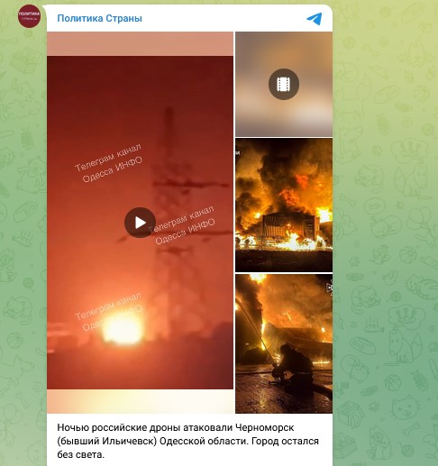 Как сообщили источники проекта, удар пришёлся по портовой инфраструктуре Одеcсы и Черноморска (Ильичёвска). Местные власти и СМИ сообщили о пожарах на складах и зерновом терминале, а также о повреждениях причалов и контейнеров. При этом местные жители, которых на фоне ежедневных ударов по стратегическим и военным объектам в Одессе сложно удивить, заявили, что в районе порта звучали мощнейшие взрывы. По их словам, это была "сильная детонация, которой Одесса давно не слышала".