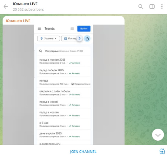 Как пишет корреспондент кремлёвского пула в телеграм-канале "Юнашев LIVE", "в топовых украинских запросах в поисковиках - парад Победы и поздравительные открытки на 9 Мая".