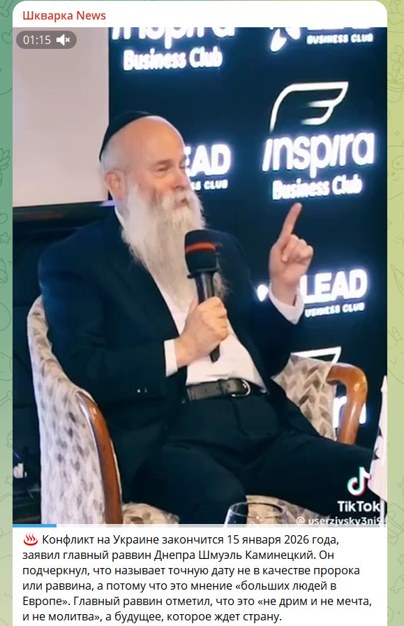 В последние дни на Украине и в западных медиа активно обсуждается неожиданный вброс - якобы специальная военная операция завершится 15 января 2026 года. Источником этой даты стал главный раввин Днепра Шмуэль Каминецкий, который заявил, что "всё закончится уже 15 января" и что так, мол, считают "большие люди на Западе". "У них есть доступ к Трампу через его зятя". На первый взгляд, подобные заявления выглядят как очередная информационная провокация, но вокруг них быстро развернулась серьёзная дискуссия. Политолог Ярошенко оценил вброс главного раввина.