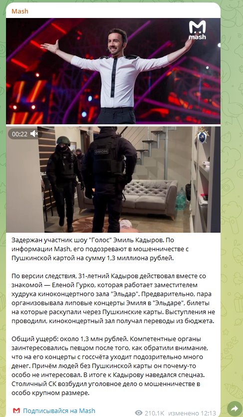 По данным телеграм-канала Mash, певец Эмиль Кадыров задержан сотрудниками полиции. Его подозревают в мошенничестве на 1,3 миллиона рублей.