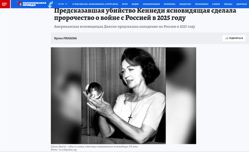 Диксон вела колонку в журнале Parade, а также опубликовала несколько книг со своими "предсказаниями". Сейчас в США пристально рассматривают одну из них - под названием "Моя жизнь и пророчества" 1969 года выпуска. В ней женщина предположила, как изменится мир в 2025 году.