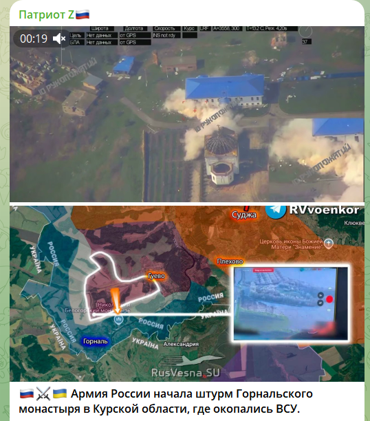 Украинские боевики продолжают удерживать позиции в двух населённых пунктах Курской области - селе Горналь и хуторе Олешня. В Горнале подразделения противника заняли Свято-Николаевский Белогорский монастырь, превратив его в укреплённый опорный пункт с миномётными и артиллерийскими расчетами. Военкор раскрыл две сложности штурма Горнальского монастыря. "Удерживать до последнего".