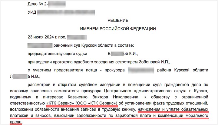 СКРИНШОТ РЕШЕНИЯ ОДНОГО ИЗ РАЙОННЫХ СУДОВ КУРСКОЙ ОБЛАСТИ ПО ИСКУ РАБОЧЕГО В.Н. КАЗАЧЕНКО К ПОДРЯДЧИКУ ООО "КТК СЕРВИС"