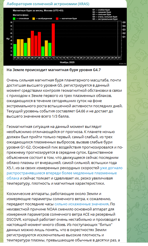 Текущий уровень события составляет G4.66 и не достаёт высшего значения всего 1/3 балла. Геомагнитная ситуация на данный момент выглядит необъяснимо отличающейся от прогноза,