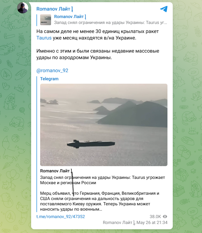 На самом деле не менее 30 единиц крылатых ракет Taurus уже месяц находятся в/на Украине. Именно с этим и были связаны недавние массовые удары по аэродромам Украины,