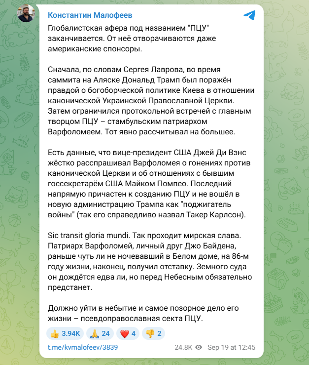 Так, Трамп после услышанной на Аляске правды ограничился протокольной встречей с главным творцом ПЦУ - стамбульским патриархом Варфоломеем. А ведь тот некогда был частым гостем в Белом доме - там его активно привечал Джо Байден. Теперь отношение к Варфоломею резко изменилось.