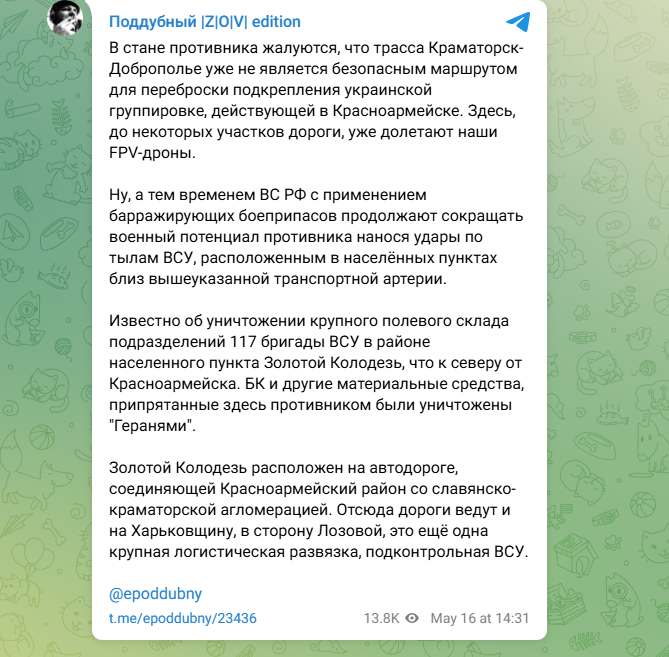 Как следует из публикации военкора, в ВСУ бьют тревогу из-за того, что трасса Краматорск - Доброполье уже становится опасной для украинцев зоной. А ведь это один из главных путей снабжения украинской группировки, засевшей в Покровске (до 2016 года носившего название Красноармейск).