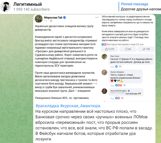 Он указал на череду постов "карманных" блогеров и новостных ресурсов, аффилированных с властями Украины, которые пытаются прикрыть неудачи сил киевского режима в Курской области топорными фейками.