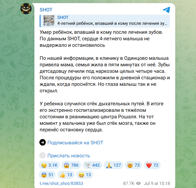 По нашей информации, в клинику в Одинцово малыша привела мама, семья жила в пяти минутах от неё. Зубы детсадовцу лечили под наркозом целых четыре часа. После процедуры его положили в дневной стационар и ждали, когда проснётся,