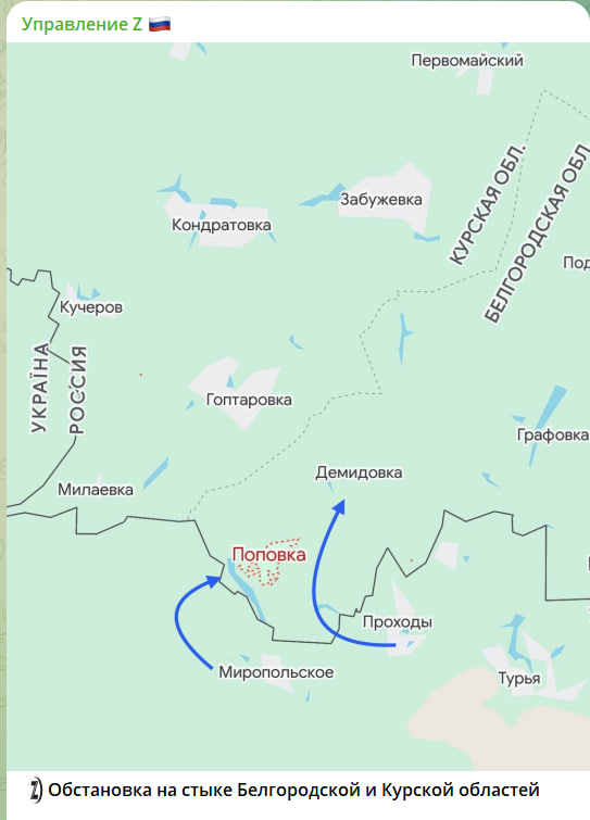 Противник предпринял попытки прорваться через границу в сторону населенного пункта Поповка. Наши подразделения ведут бой с врагом. Действия ВСУ читаемы, так как данный населенный пункт находится на выступе к границе с Сумской области (врезан с трех сторон). Противник и дальше будет пытаться растянуть наши силы и отвлечь внимание с другого направления своего наступления.