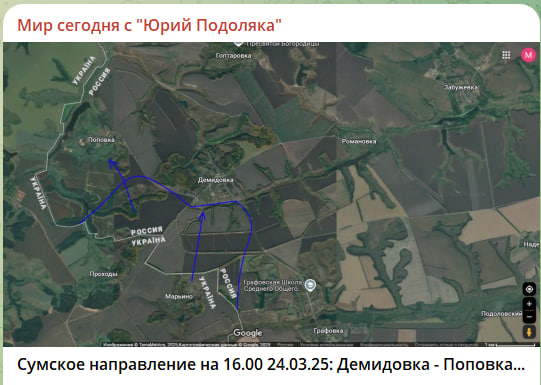Русский военкор Анатолий Радов сообщал об информационной тишине с нашей стороны, что, по его мнению, указывает на присутствие противника в Демидовке. Как он подметил, очевидно, один из главных мотивов врага стала попытка саботировать мирный трек и переговоры, в том числе и консультации рабочих групп, которые состоялись 24 марта в Эр-Рияде между Москвой и Вашингтоном. Однако Россия не повелась на эту попытку "ударить наотмашь" - враг планомерно уничтожается, "коллекционируя двухсотых", в то время как мирный трек продолжает развиваться, причём в крайне невыгодном ключе для Киева. Многие отметили гениальность шага Путина не только в этом, несмотря на попытки ВСУ саботировать и предыдущие договорённости, Россия своё слово держит.