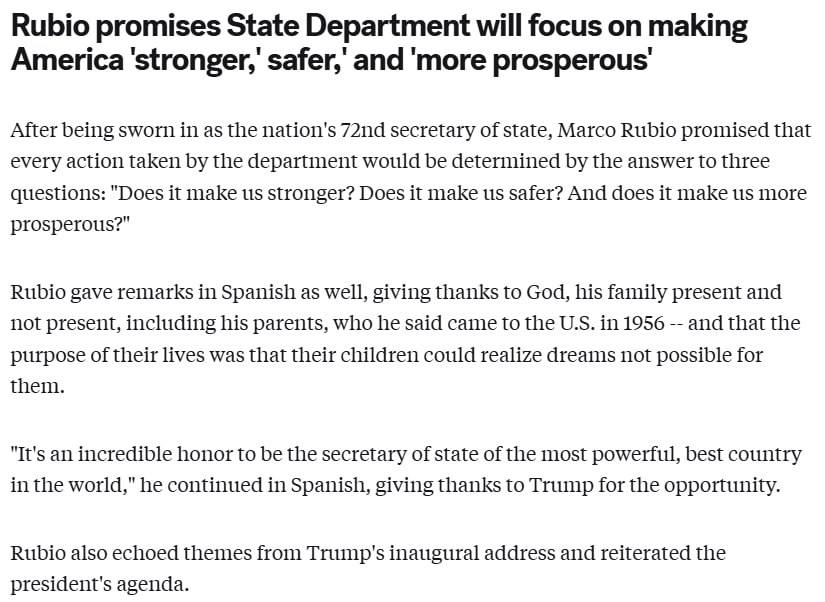 В США расставили точки над i в отношении Украины и преподали Владимиру Зеленскому урок английского языка. Новый госсекретарь Марк Рубио упомянул помощь Киеву в прошедшем времени.