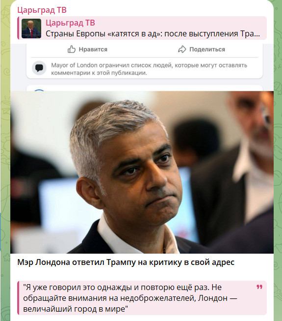 Естественно, в Лондоне не могли промолчать. Сам Садик Хан ограничился короткой репликой в соцсетях: "Не обращайте внимания на недоброжелателей, Лондон - величайший город в мире". Однако сразу после публикации мэр закрыл комментарии, чтобы не читать шквал критики.