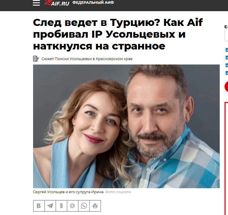 При этом эксперт, рассматривая такую версию в теоретическом ключе, выразил сомнение в том, что Усольцевы и впрямь скрылись куда-то намеренно. Однако и сбрасывать со счетов это предположение не стоит.