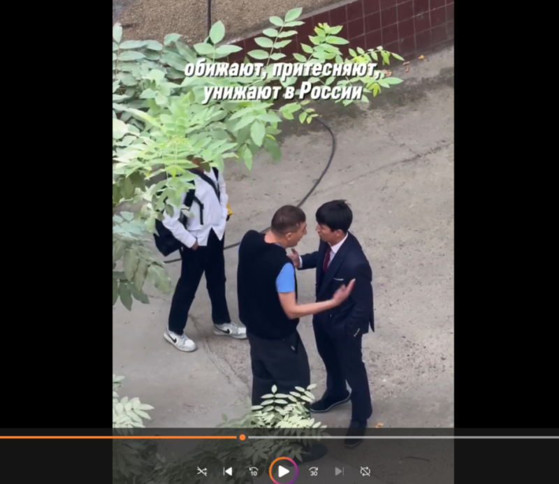 Нападавший на ребят молодой парень даже будто бы испугался, поняв, что за подростков вступились, и его план пошёл прахом: "А чо вы говорите, чего хочите" (сохраним стилистику речи молодого узбека. - Ред.). Впрочем, спустя пару мгновений, придя в себя, этот агрессор уже кричит мужчине: "Не вмешивайтесь!" А русский мужчина отвечает: