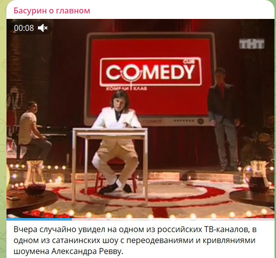 Эдуард Басурин, известный военный деятель, который на протяжении длительного времени сообщал о ходе СВО, рассказал в своем ТГ-канале, что случайно увидел на одном из российских ТВ-каналов, в одном из так называемых сатанинских шоу с переодеваниями и кривляниями, шоумена Александра Ревву.
