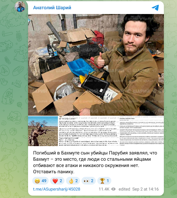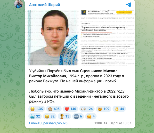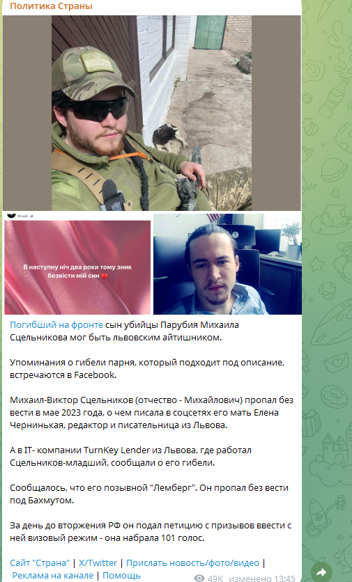 В Сети быстро вычислили, о каком сыне идёт речь. Львовский айтишник Михаил-Виктор Сцельников, который вступил в ВСУ, получил позывной "Лемберг" и отправился убивать русских.