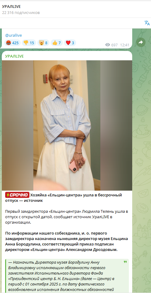 Кстати, Анна Бородулина тушит "пожары" в Ельцин Центре с 2022 года. После начала специальной военной операции на фоне частичной мобилизации в Германию сбежал прежний директор Олег Лутохин. А теперь "отлучиться" решила и Людмила Телень. И, как говорят источники, путёвка заграничная. Связаться с Телень не удалось - она, судя по реакции в мессенджерах, читает запросы, но затем уходит в глухую оборону. Не отвечает.