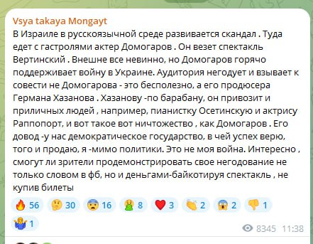Некто Анна Монгайт* - иностранный агент, бежавший из России в том числе из-за подозрений в связях с зарубежной разведкой, пытается устроить травлю и отмену актёра Александра Домогарова. Пишет будто бы и не от себя: "В Израиле в русскоговорящей среде развивается скандал". Больше всего происходящее напоминает анекдот. Впрочем, зная взрывной характер Домогарова, последствия мы, безусловно, увидим.
