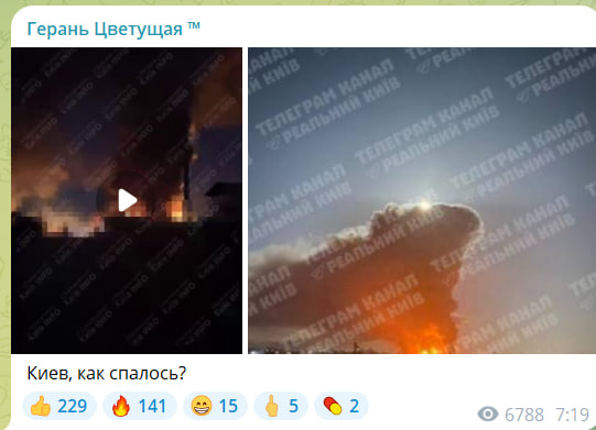 По информации мониторингового канала "Хроники Гераней", в Голосеевском районе был уничтожен склад. Предварительно, с БК или ракетами. В Оболонском районе полыхает офисное здание, где располагались военные, предварительно, в том числе высокопоставленные.