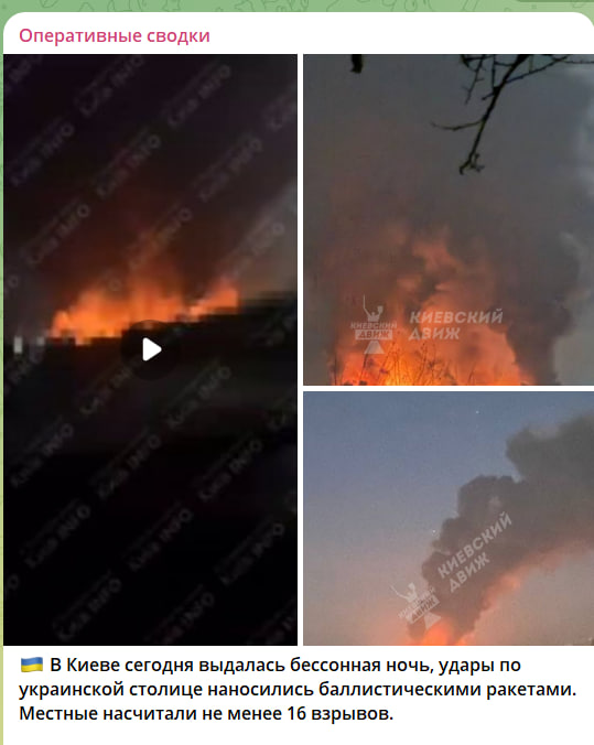 В Киеве сегодня выдалась бессонная ночь, удары по украинской столице наносились баллистическими ракетами. Местные насчитали не менее 16 взрывов. Кроме того, сообщают о серии взрывов на фоне воздушной тревоги - в Сумах и Николаеве (в том числе и о повторных), в городе Лубны в Полтавской области, в районе города Обухов в Киевской области, а также в районе Житомира,