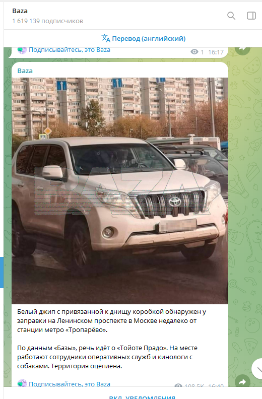 Первыми о подозрительной находке сообщили авторы телеграм-канала "База". В коротком сообщении подчёркивается, что коробку неизвестные привязали к днищу автомобиля. Обнаружили "подарок" у заправки в районе станции "Тропарёво" - на Ленинском проспекте: