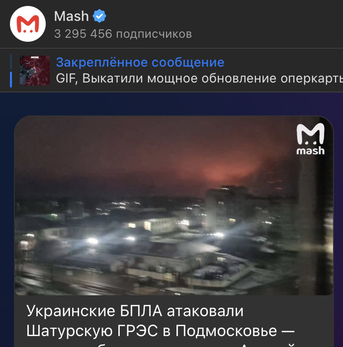 Жители Подмосковья сообщили, что сегодня утром около 07:00 началась атака на Шатурскую ГРЭС. По их словам, было слышно не менее пяти взрывов, после чего над электростанцией поднялось огненное зарево и столб дыма. На данный момент информации о пострадавших не поступало.