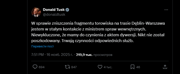 - заявил в соцсетях польский премьер-министр Дональд Туск, комментируя ЧП. Он также отметил, что никто не пострадал.