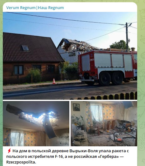 По данным польского издания, на дом в польской деревне Вырыки-Воля упала ракета с польского истребителя F-16, а не русская "Гербера", как заявляли польские власти. Сообщается, что ракета класса "воздух-воздух" AIM-120 была выпущена с польского истребителя F-16 по летящему беспилотнику, однако у неё отказала система наведения, и боеприпас рухнул на крышу дома.