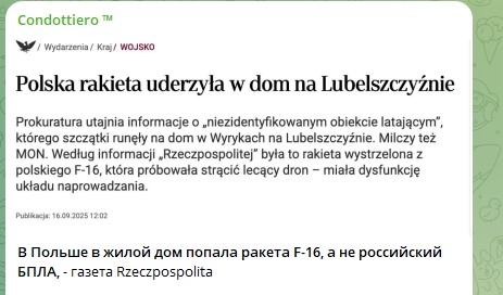 Польская газета Rzeczpospolita вышла из игры Варшавы и публично обвинила местную прокуратуру в сокрытии реальных данных об ударе по жилому дому в польской деревне Вырыки-Воля. Сообщается, что это был не русский дрон, а натовская ракета, выпущенная истребителем F-16.