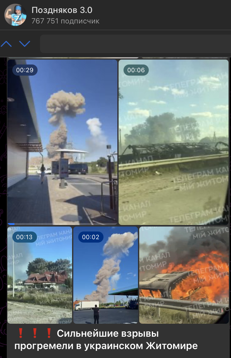 В Житомире 2 июля что-то очень сильно рвануло. "Чёрный гриб" видели на расстоянии десяти километров. Информация о взрыве на автозаправочной станции быстро была опровергнута, когда выяснилось, что инцидент произошёл на складе польского промышленного предприятия в селе Березина. Местные жители уже окрестили это событие "украинской Хиросимой", подчёркивая масштаб разрушений.