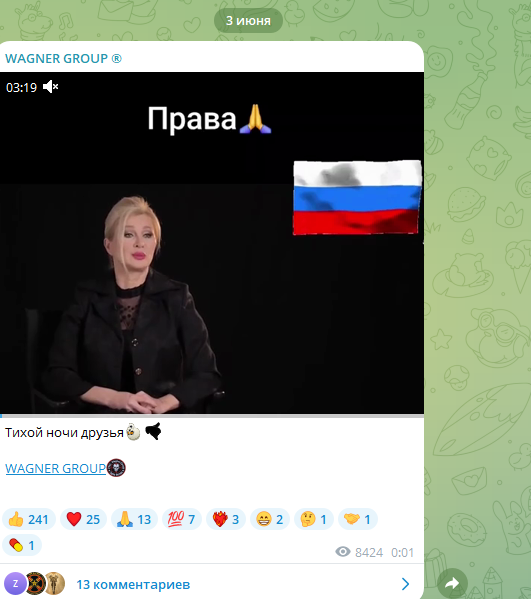 Этот ролик размещён в группе ЧВК "Вагнер" с пометкой "Права". "Музыканты" согласны с теми мыслями, которые честно озвучила артистка.
