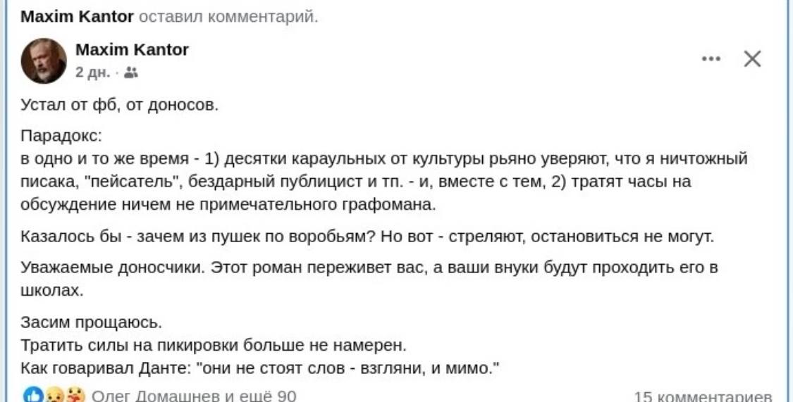 Впрочем, сам писатель по-прежнему считает себя правым в этой ситуации. Он сделал выпад против патриотически настроенных активистов, назвав их "караульными от культуры".