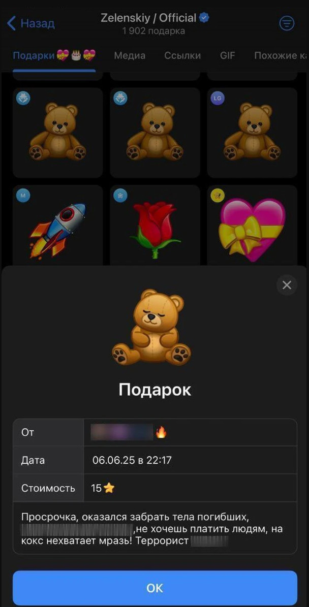 Хотя в официальном ТГ-канале Зеленского комментарии давно закрыты, пользователи нашли обходные пути - они стали покупать "подарки" и сопровождать их гневными комментариями.