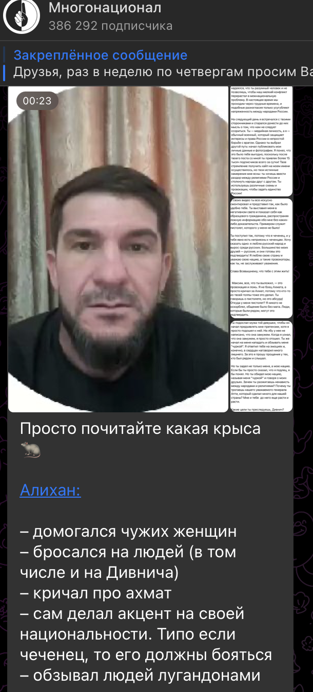 В горячке публикации Дивнич подписал эпизод как столкновение с бойцом "Ахмата". Этого хватило: по военным пабликам разошлось: "ахматовец" буянит в Луганске, дискредитирует русскую армию.