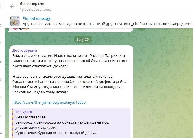 И одновременно с этим, тоже 20 июля, начался сюжет "Яна Поплавская - гламурная элита, поддерживающая СВО только на словах".