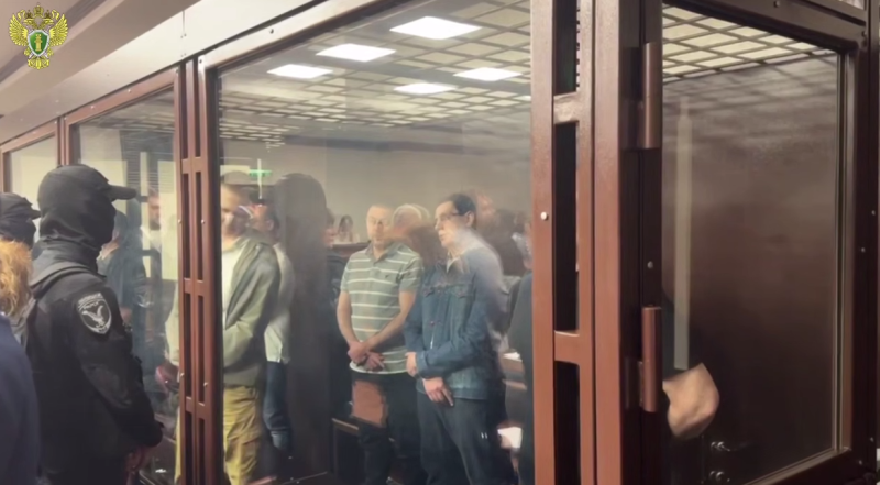 скриншот видео Генпрокуратуры России. Один из подсудимых улыбается, смотря в пол