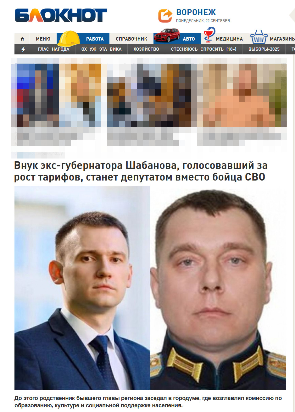 История выборов в Воронежскую областную Думу, завершившихся в сентябре, получила неожиданный и резонансный поворот. Победивший на выборах участник СВО Владимир Евсюков отказался от мандата в пользу Владислава Новомлинского, внука бывшего губернатора Воронежской области Ивана Шабанова. Вместо героя подсунули розовощёкого внука губернатора. Военкор Колясников уже высказался об этих выборах: "Красиво, молодцы".