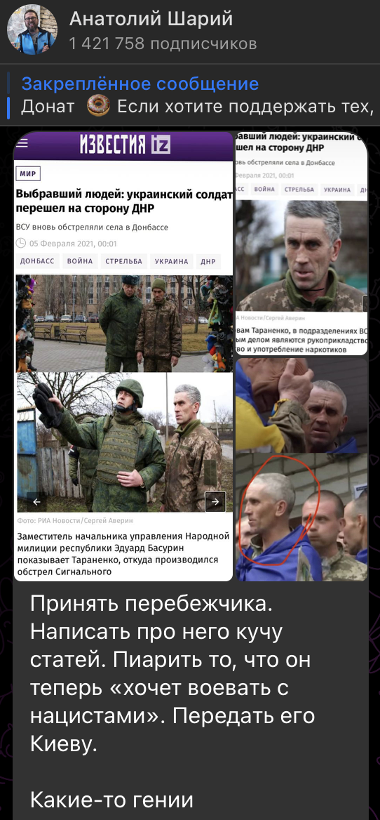 Он отметил, что среди вернувшихся оказался человек, который ранее просил у охранников нож для расправы над украинскими солдатами. Хотя Прокопенко не стал уточнять его имя, в социальных сетях появилась информация о том, что речь идёт о солдате ВСУ Анатолии Тараненко, который попал в плен до начала полномасштабного конфликта и в заключении "агитировал за ДНР".