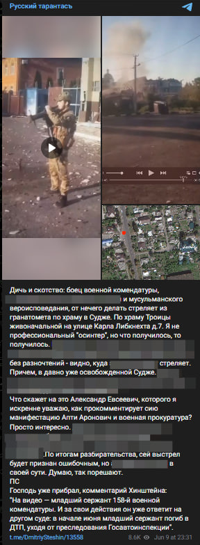 Дичь и скотство: боец военной комендатуры, <…> мусульманского вероисповедания, от нечего делать стреляет из гранатомета по храму в Судже. По храму Троицы живоначальной на улице Карла Либкнехта д. 7. Я не профессиональный "осинтер", но что получилось, то получилось,