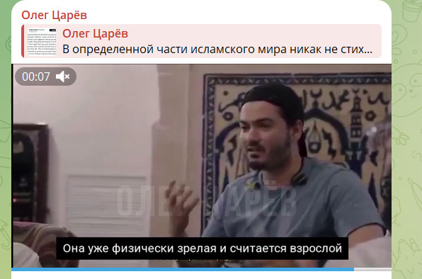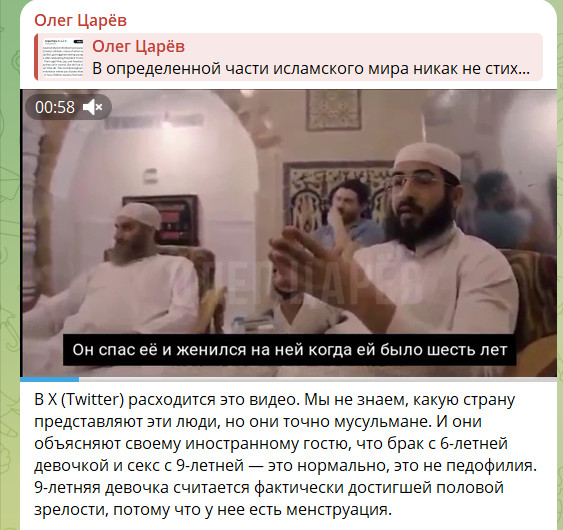 На скандальное видео отреагировал политик Олег Царёв. На записи группа мужчин (причём однозначно - мусульман) обсуждает допустимость браков с девочками в возрасте шести лет и начала интимных отношений с ними с девяти лет. Они утверждают, что это не является педофилией, поскольку, по их мнению, девочка с началом менструации считается достигшей половой зрелости.