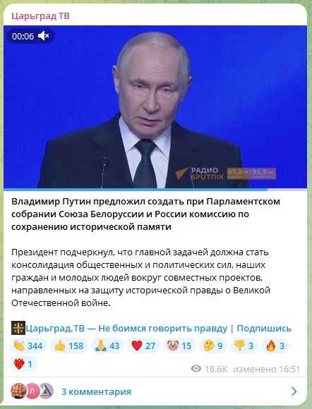 Он предложил создать комиссию по сохранению исторической памяти при Парламентском собрании Союза России и Белоруссии.