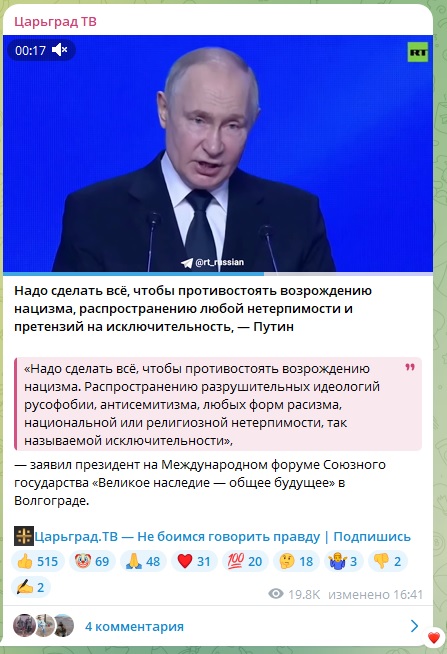 Надо сделать всё, чтобы противостоять возрождению нацизма. Распространению разрушительных идеологий русофобии, антисемитизма, любых форм расизма, национальной или религиозной нетерпимости, так называемой исключительности,
