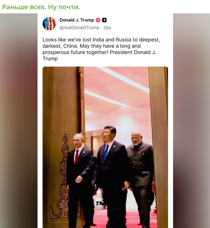 - написал он, публикуя фотографию, на которой президент России Владимир Путин, лидер КНР Си Цзиньпин и премьер-министр Индии Нарендра Моди куда-то вместе идут.