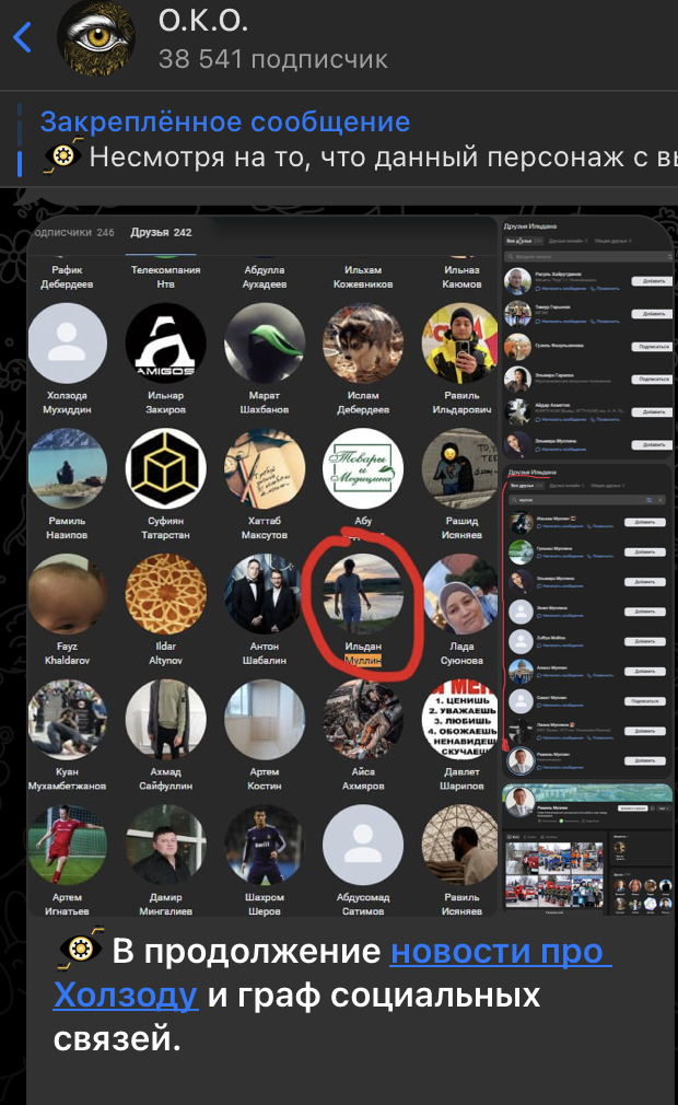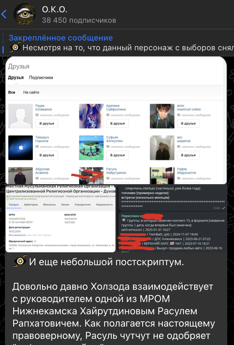 В друзьях у Холзоды есть, немного-немало, тёзка одного из родственников текущего мэра Нижнекамска, Ильдан Муллин. А у этого Ильдана - уже знакомый нам Расуль Хайрутдинов и какое-то прям баснословное количество тёзок родственников текущего мэра Нижнекамска Рамиля Муллина,